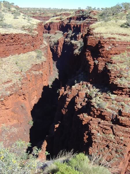 Karijini National Park , Hamersley RangesThis is Joffre Gorge. Water has carved the shape of the land in a slow process of erosion out of rocks that are 2000 million years old. This has happened during the last tens of millions of years when the sea level dropped sharply causing rivers to downcut rapidly. Previous | Album | Next |