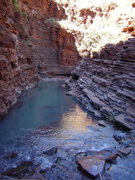Karijini National Park , Hamersley RangesOnce at the bottom of the ladder you are in Hancock Gorge. The track takes you to the water and from there you have to clamber around the rocks. The late wet season has meant a much wetter walk than you would experience later in the year. Previous | Album | Next |