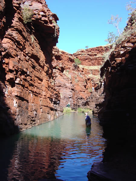 Karijini National Park , Hamersley RangesYou either had to climb along the edges of Hancock Gorge walls or wade through the water in the river. This section was easiest walked through with shoes off - why didn't we remember the reef walking shoes as they would have been perfect. Of course they were back at camp! Previous | Album | Next |