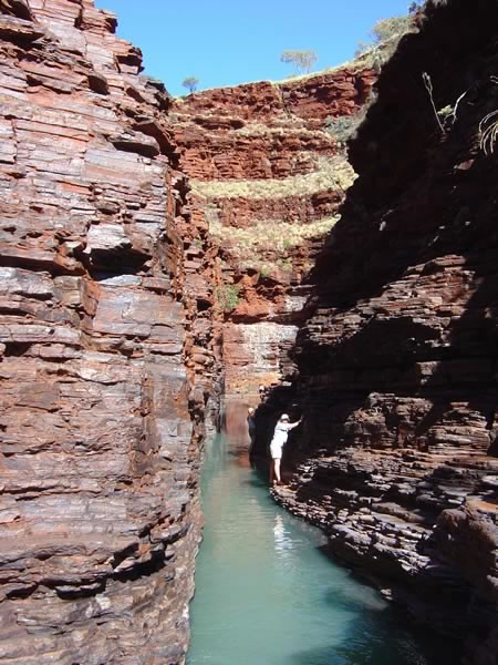 Karijini National Park , Hamersley RangesThe water flowing through Hancock Gorge was a bit deeper here so we opted for climbing along ledges made by the banded rocks. We were hoping we didn't drop the camera in the water! This was a bit of a challenge! Previous | Album | Next |