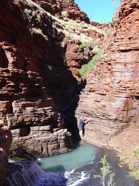 Karijini National Park , Hamersley RangesThere was a small waterfall that plunged into a rock pool just before the gorge did a 90 degree turn towards Kermit's Pool. The water here was flowing at a considerable pace. We hung onto the cliff face and had a look around the bend and decided that was far enough for us as the walk was upgraded to a 'class 4' after this point. All walks are graded and 'class 4' means 'trails may go over steep, slippery and unstable surfaces'. Previous | Album | Next |