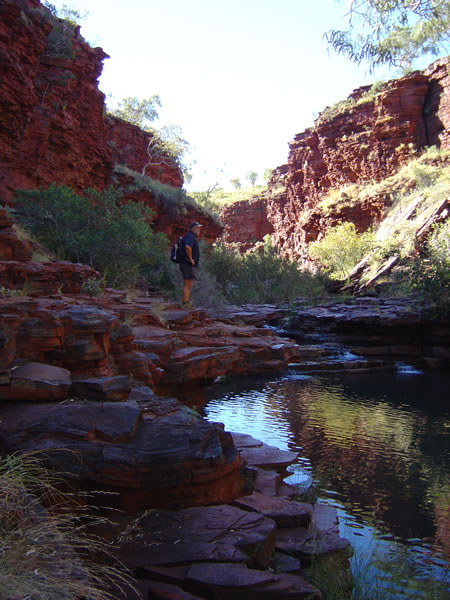 Karijini National Park , Hamersley RangesNext we tackled the walk along Weano Gorge to the Handrail Pool. It starts as 'class 3' but ends in the Handrail Pool as a 'class 4' and gets harder still after that. It takes 1.5 hours to travel the return 1km track to the pool. Previous | Album | Next |