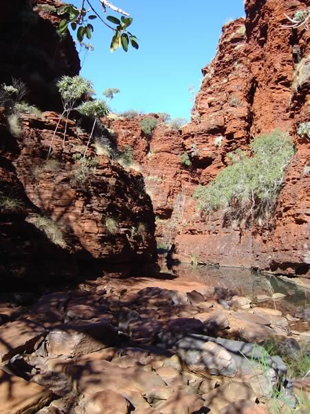 Karijini National Park , Hamersley RangesThe gorges provide a refreshing retreat from the arid plains above with their clear fresh pools. There is a bit of rock hopping on this track but otherwise this is an easy walk up until the Handrail Pool. Previous | Album | Next |
