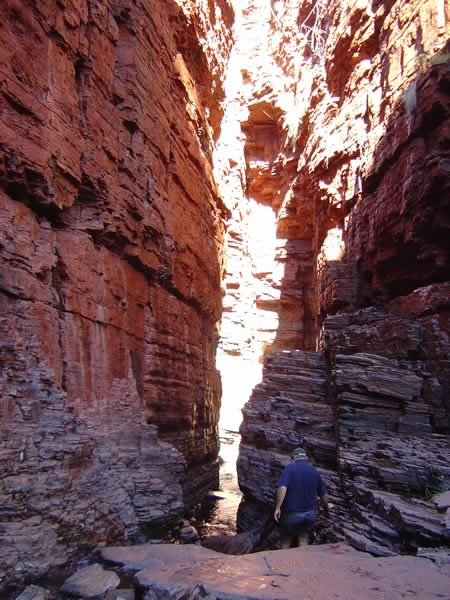 Karijini National Park , Hamersley RangesWeano Gorge narrows and you need to wade through the water. Later in the season this would probably be dry enough to rock hop through without getting your feet wet. Where is the excitement in that?! Previous | Album | Next |