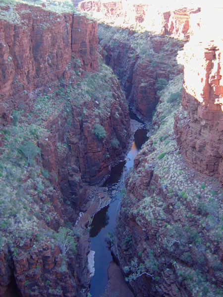 Karijini National Park , Hamersley RangesFrom the Knox Lookout you can look to the left up Wittenoom Gorge from the place where it meets the Knox Gorge. Blue Asbestos was mined in Wittenoom in the 1930s . It occurs in thin veins in the iron formations. Mining ceased in the 1960s. Asbestos dust causes cancer so you shouldn't disturb the rock. Previous | Album | Next |