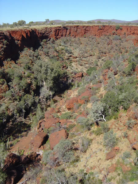 Karijini National Park , Hamersley RangesA short drive or walk from Dales Campground and you come to Dales Gorge. You can walk from Fern Pool to Fortescue Falls to Circular Pool along the gorge floor and return via the Dale Gorge rim walk. If you look carefully you may see small 'dots of people' doing the walk. Previous | Album | Next |