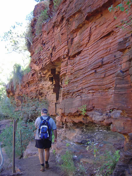 Karijini National Park , Hamersley RangesThe rocks in the gorge wall are a striking red colour due to the high iron content. The walk follows the vertical gorge wall for 2km from Fortescue Falls to Circular Pool. Another impressive walk. Previous | Album | Next |