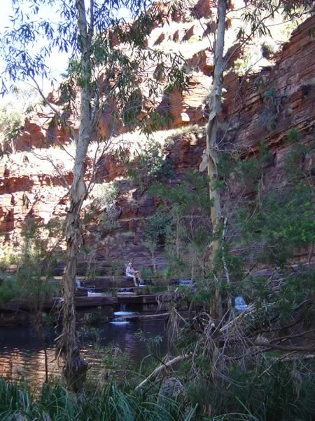 Karijini National Park , Hamersley RangesWe were heading along Dales Gorge on our three-hour return trail to Circular Pool. There are a number of smaller pools and rapids along the way with nice spots like this to stop for a break, listen to the water and the birds. Previous | Album | Next |