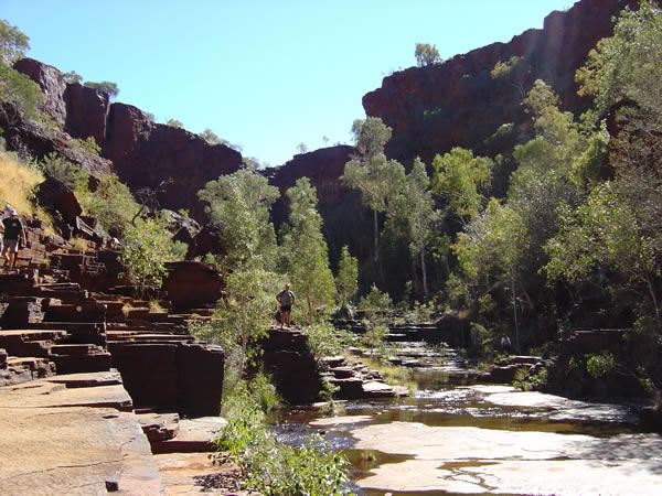 Karijini National Park , Hamersley RangesThe way the blocks of rock have broken apart forms a series of 'steps' that you can negotiate as you make your way up Dale Gorge. We are amazed by the colours of these ancient rocks. The gorge widens as we get closer to Circular Pool. Previous | Album | Next |