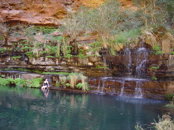 Karijini National Park , Hamersley RangesThe view down into Circular Pool from the rim of the gorge shows just how deep the gorge is. To get an idea of size have a look at me enjoying the thermal springs that you see on the far side of the pool below. Previous | Album | Next |