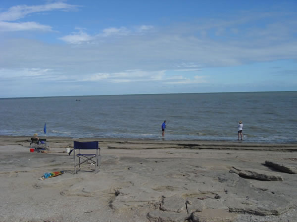 Karumba on the Gulf to Gregory River RegionThere is a bit of beach but a lot of it is rock made from shells cemented into limestone - no chance of putting up the umbrella for shade unless you brought a jackhammer! Although there are salt water crocodiles in this water we are told it is OK to fish from the waters edge but don't go swimming. Previous | Album | Next |