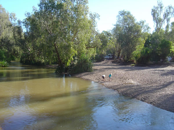 Karumba on the Gulf to Gregory River RegionThe Gregory River was still flowing pretty fast. The locals at the Gregory Hotel told us that the previous week the water was right over the causeway here and you couldn't camp on this lower area at all. A lot of people seem to know about this free camp and have set themselves up amongst the trees. Previous | Album | Next |