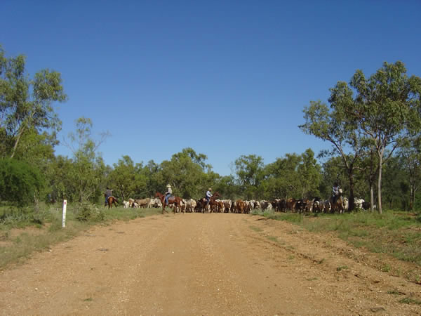 Karumba on the Gulf to Gregory River RegionThey were mustering on Lawn Hill Station and we had to stop while they passed. There were about 12 on horseback, a helicopter as well as motor bikes rounding up the stragglers. Support vehicles came along behind with the food and drinks. Really interesting to see. Next stop would be Lawn Hill - now called Boodjamulla. Previous | Album | Next |