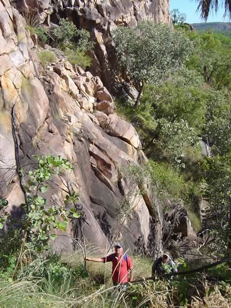 Nitmiluk - Katherine Gorge National ParkAfter the cruise we decided to see the Nitmiluk Gorge from the cliff edge. This walk we chose goes virtually straight up the cliff face. We sure worked off a bit of energy climbing up this one but imagined the views would be impressive at the top. Previous | Album | Next |