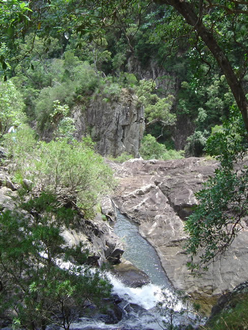 Conondale National Park - Booloumba Falls, QueenslandThis is the view from the lookout at the end of the 3km walk. The water drops off into the gorge below. The rocks have eroded to form 'The Breadknife' in the gorge. You can see it better in the next photo of the same area taken previously in winter. Previous | Album | Next |