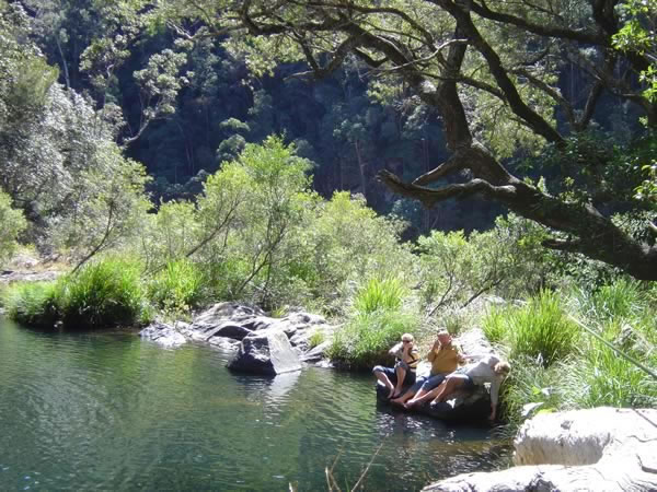 Conondale National Park - Booloumba Creek, QueenslandWe were certainly hot enough to jump in for a swim but we hadn't brought towels and togs. It was nice and cool just to leave your feet in for a while. You can see Booloumba Creek drops off again after this pool down to the creek below that runs down towards our campgrounds. Previous | Album | Next |