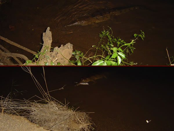 Kununurra & Lake ArgyleHere is our visiting crocodile up close - in fact right next to the bank 3 metres from our caravan door!!! Apparently he is a regular visitor. He stayed around for a couple of hours and eventually caught himself a catfish. We were near the BBQ area where there was a light pole and this seemed to attract fish, turtles and this crocodile. Previous | Album | Next |