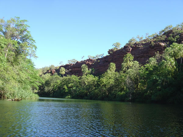 Lawn Hill Gorge, Boodjamilla National ParkAs we came around a bend in Lawn Hill Creek (more like a river here), we saw a freshwater crocodile on a log near the left bank. It totally ignored us as we paddled up for a photo. It was a freshwater crocodile so we were not worried it would attack us. Previous | Album | Next |