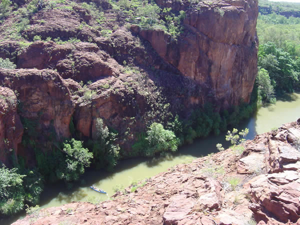 Lawn Hill Gorge, Boodjamilla National ParkAs we neared the end of middle gorge we spotted their canoes again in the creek below. The cliff edges are quite high and almost vertical here. There is limited vegetation so it can be quite hot walking even in winter. Remember to take plenty of water with you to drink. The rocks near the edges can be loose so you need to take care here. Previous | Album | Next |
