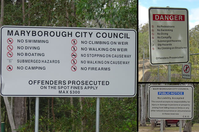 Teddington Weir, Maryborough, QueenslandThe dust driven by the wind became unbareable at Lenthalls Dam on Sunday so we headed off to see Teddington Weir, 11km from Maryborough. When we arrived we were amazed to see signs everywhere you looked... no this, no that... A little over the top I think. Even a warning about no liability for falling limbs off trees or in fact ANY natural occurence. Previous | Album | Next |