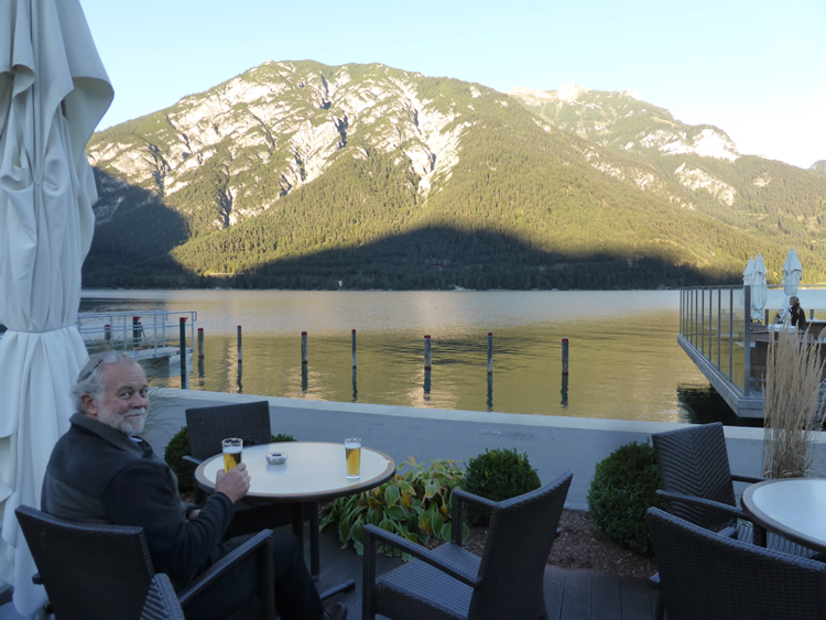 UK and Europe Roadtrip - Lake AchenWe decided to have a beer beside Achensee before heading back to our Motorhome for the night. We watched the shadows creeep up the mountains unsure if they were the Karwendel mountains or the Brandenberg Alps. Both surround the lake. Select the photo below to see the lake next morning as the sun came up.. Previous | Album | Next |