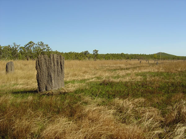 Litchfield National Park, Northern TerritoryThe National Park covers 1500 sq km and has a variety of typical NT habitats. It is hard to get an idea from a photo what these termite mounds look like. They are about a metre wide and up to 2 metres tall BUT only about 30cm thick and they all line up the same way. They should be called termite slabs not mounds! You can see a whole field of them here off into the distance. Previous | Album | Next |