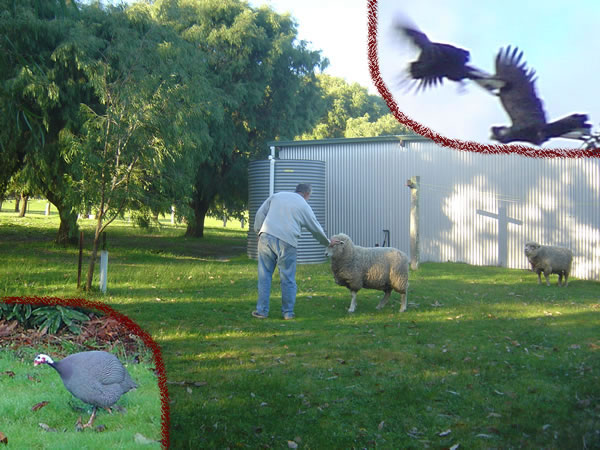 Margaret River to Cape LeeuwinSheep wander freely around the campsite as well as Guinea Fowl. Black Cockatoos loved to eat the flowers from the trees near our van but were a bit camera shy. They have a cream coloured tail rather than the red tail we had seen before in Queensland. Previous | Album | Next |