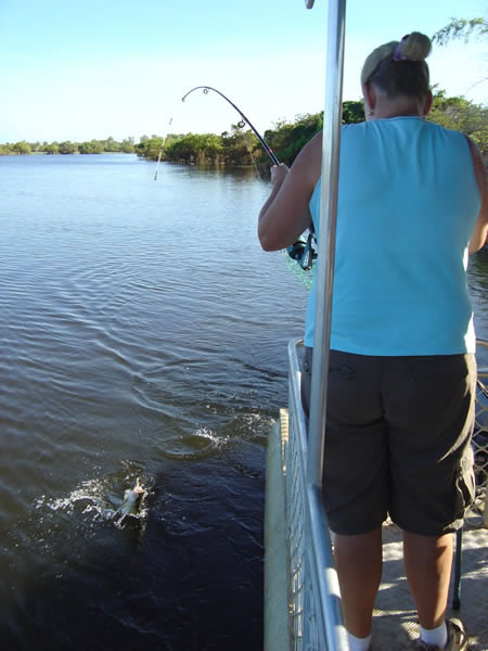 Mary River Boat Hire, Northern Territory WetlandsKaren scores again. The rest of us were happy sitting there enjoying the scenery - well I guess we would have liked to catch something but it didn't seem to be our day. Maybe it was time to start cooking our breakfast BBQ! Previous | Album | Next |