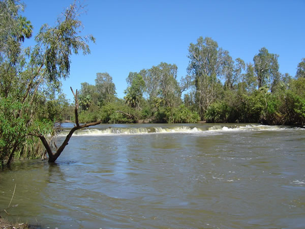 Mataranka FallsHere is the view of Mataranka Falls looking up river. The falls don't look all that awe inspiring in the flooded Roper River from this angle. We still agreed that it was worth the walk. It will be interesting to come back and see it again once they recover from the flooding. Previous | Album | Next |