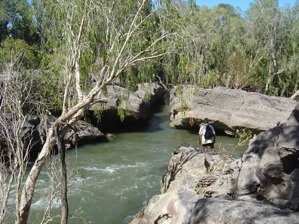 Douglas Daly RiversThe river was swollen (floods affecting here too) so too dangerous for swimming. You can usually swim through 'The Arches', seen here, and out the other side into the swimming hole. The water is swirling and flowing too swiftly for that today. Previous | Album | Next |