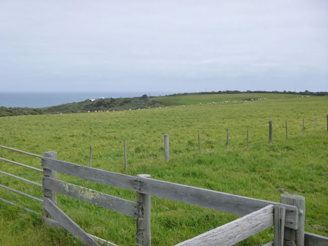 Brisbane to Melbourne RoadtripWe did a day trip through the rest of Cape Liptrap Coastal Park and out to the lighthouse. See all those little white dots in the photo? They are sheep and they were all over here by the gate until I got out to take a photo of them! This farm is right on the cliff so hopefully they didn't keep running right off the edge! Previous | Album | Next |