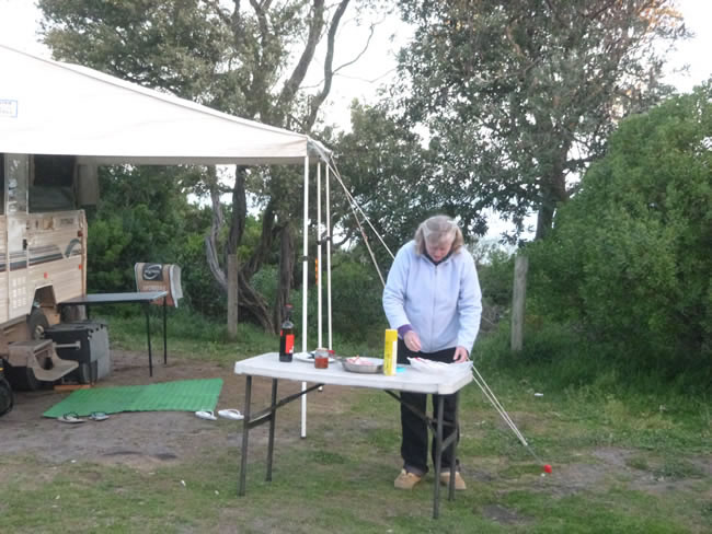 Brisbane to Melbourne RoadtripThe chef was poking around in the fire while the cook was busy preparing the food! Nothing to do with the meal, but just behind our campsite was a wombat hole. We didn't spot him but other campers said they were definitely around. The only wombats we have seen this trip have been hit by cars on the road - very sad. Previous | Album | Next |