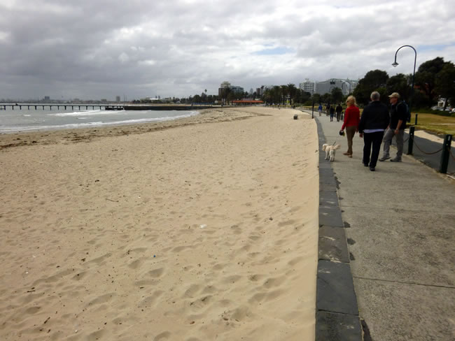 Brisbane to Melbourne RoadtripWe weren't tempted to go in for a swim during our walk along the front of St Kilda Beach. It was too cold, overcast and windy today. We stopped for coffee and cake at one of the local cafes instead. Previous | Album | Next |