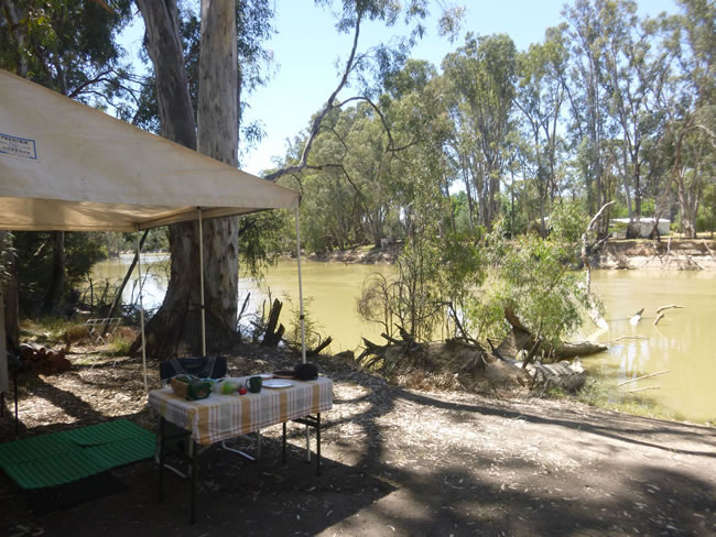 Brisbane to Melbourne RoadtripWe found a number of campsites on the Murray River side of Gunbower Island, Victoria. Across the river was New South Wales. It was muddy and quite fast flowing in the narrower sections and on the river bends but not too bad here. Previous | Album | Next |