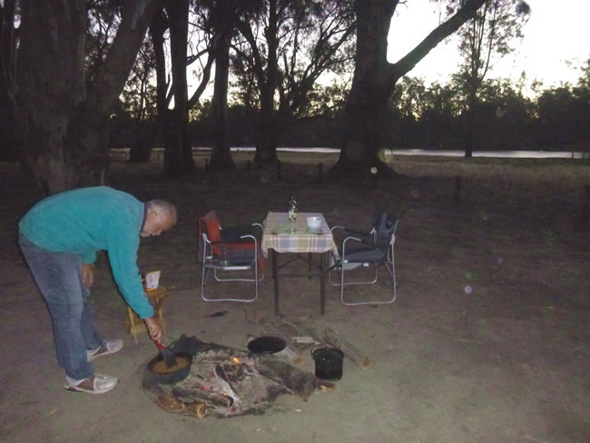 Brisbane to Melbourne RoadtripWe pulled up the canoe and thought about an option for dinner. We still had no fish to cook so Sate Sausages were on the menu for tonight. For this and other recipes see our 'Food Page'. This was a nice dinner setting! Previous | Album | Next |