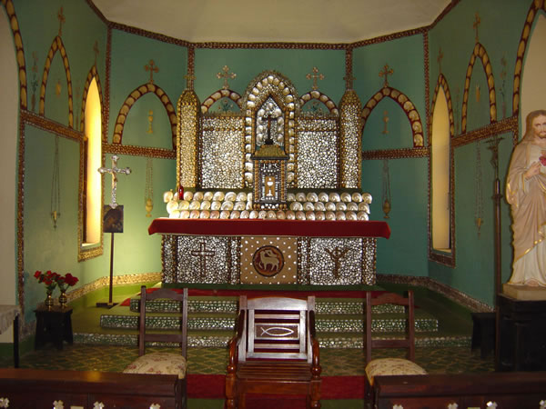 Middle Lagoon, Dampier PeninsulaThis church was once part of a Catholic Church Mission. The altar is totally covered in mother of pearl shell and other polished shells. The shells decorate the walls, floors, windows, steps, everywhere... it is truly amazing the amount of work that has gone into it. Have a look at one of the side altars which is beautifully decorated too. This church is still in use and they rely on donations to restore the decorative work as required. Previous | Album | Next |