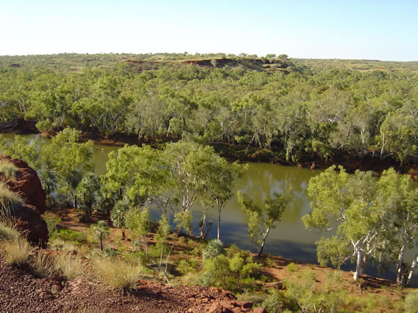Millstream Chichester National ParkHeading back towards the coast you next come to the Millstream Chichester National Park. It encompasses the Chichester Ranges (similar to the Hamersley Ranges at Karijini) and the area surrounding the Fortescue River.and the Millstream Oasis. We hoped to canoe and fish the river from the Deep Reach Pool campsite (downstream from here) but unfortunately it was closed due to flood damage. Previous | Album | Next |