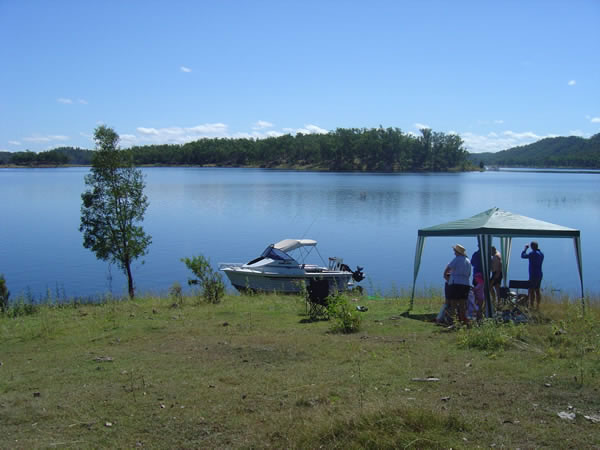 Lake Monduran - QueenslandThe major activity here at the lake is boating, skiing, canoeing and fishing. Today we towed the canoe out with us behind the power boat and set up our gazebo on this grassy area for a bit of fishing and canoeing. Previous | Home | Next |