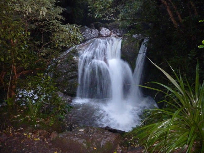 South Island New ZealandWe left the Banks Peninsula and headed inland towards Mt Hutt / Mt Somers so that we could do one of the walks in the area. This is Sharplin Falls. The walk leaves from the carpark, crosses a bridge at Bowyers Stream and follows it upstream for 45mins through the forest to a catwalk around a bluff before it descends to the falls. Select the photo to see the damage to the track caused by recent earthquake damage. The track was still under repair which made it a little tricky getting to the falls but as you can see they were worth the effort, even in the light rain. Previous | Album | Next |