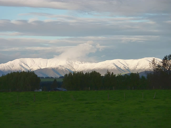 South Island New ZealandThere was no snow on these mountains as we drove in the afternoon before but the drive out from Sharplin Falls the next morning was beautiful with all the green fields dotted with white sheep and the newly snow-covered mountains behind them. Select the photo below to see more of the views from the car window - too #$@$#% cold to get out of the car this morning! Previous | Album | Next |