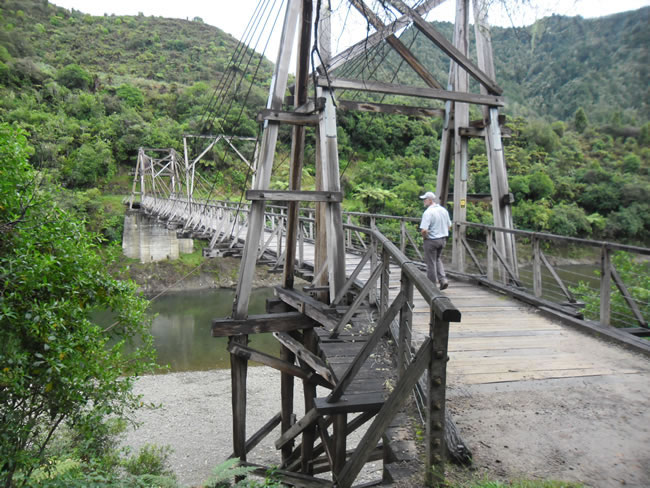 Hawkes Bay to Rotorua, New ZealandNext stop along the way was where the Tauranga Stream joined the Waioeka River. We took the short walk down to the historic Tauranga Bridge, the only surviving harp suspension bridge left in New Zealand. The land across the river was cleared for farming in 1906 but they could never make much of a go of it so the bridge goes nowhere now and the area now forms part of the Waioeka Gorge Scenic Reserve. Select the photo below to see more of this area. Previous | Album | Next |