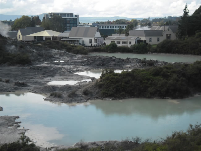 Hawkes Bay to Rotorua, New ZealandThe entrance to the Te Puia Thermal Area is from the other side of WhakarewarewaVillage. We did the self guided walk through Te Whakarewarewa Thermal Valley. This is the view across some of the hot pools to the Village. Previous | Album | Next |