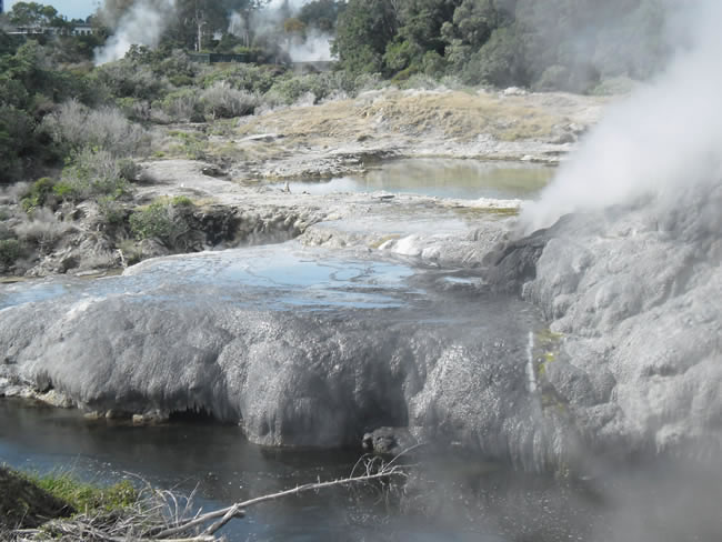 Hawkes Bay to Rotorua, New ZealandEach day in Te Whakarewarewa Thermal Valley geysers erupt, mud pools bubble and steam hisses. As the mineral enriched water and steam spurts out and flows down over the rocks it coats them and forms some really interesting and colourful crystalline features. Select the photo below to see more of this area. Previous | Album | Next |
