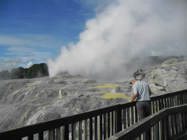 Hawkes Bay to Rotorua, New ZealandThe Pohutu Geyser erupts about 20 times a day so you won't miss it. Sometimes it shoots up as high as 30m. It is the largest active geyser in New Zealand, well the southern hemisphere actually. Select the photo below to see more of this area. Previous | Album | Next |