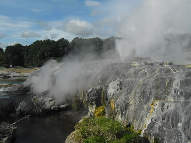 Hawkes Bay to Rotorua, New ZealandYou pass by many colourful 'sinter' terraces and pools as you follow the maze of paths through Te Puia Thermal Area. Select the photo below to see this area up closer. This is one of the best places to visit in Rotorua. Previous | Album | Next |