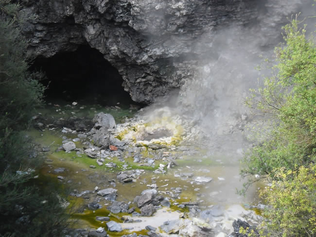 Hawkes Bay to Rotorua, New ZealandSome of the smaller pools have green and yellow sulphur-coloured mud around the edges. Bacteria and algae thrive in the warm water of the various coloured pools -some green and some blue. You can't forget this is a very active geothermal region and wonder when it is next going to demonstrate this with more violent volcanic activity. Previous | Album | Next |
