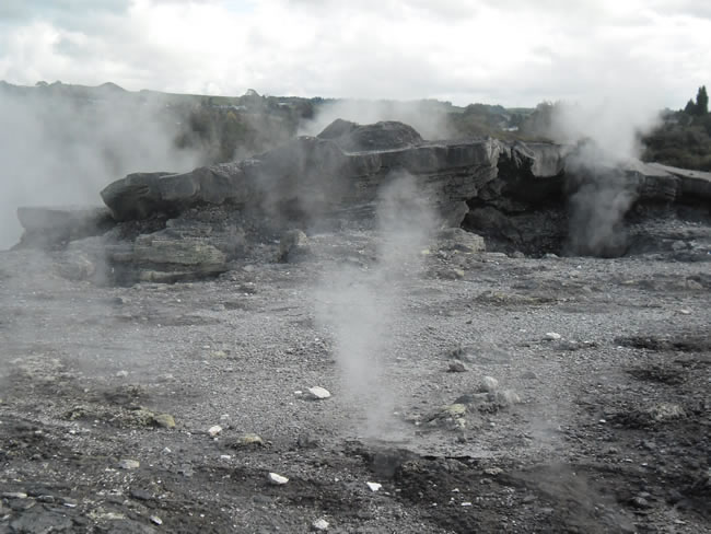 Hawkes Bay to Rotorua, New ZealandFumeroles.... they are like hot springs that have boiled off all their water before the water reaches the surface so it comes out of the cracks in the earth's crust as steam. Pretty hot. Select the photo below to see more of this area. Previous | Album | Next |