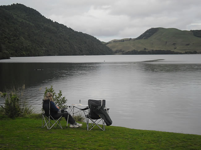 Hawkes Bay to Rotorua, New ZealandThere was a DoC site on the edge of Lake Okareka which sounded nice so we decided to stay the night there - Campsite 23. It was only small, so if you go there don't leave it too late to arrive. We set up for our nightly ritual of wine and nibblies beside the lake just in front of our campsite. Very relaxing... no sunset tonight as it was again quite overcast. I guess if you want NZ to retain its lovely greeness then you have to put up with a fair bit of rain! Previous | Album | Next |