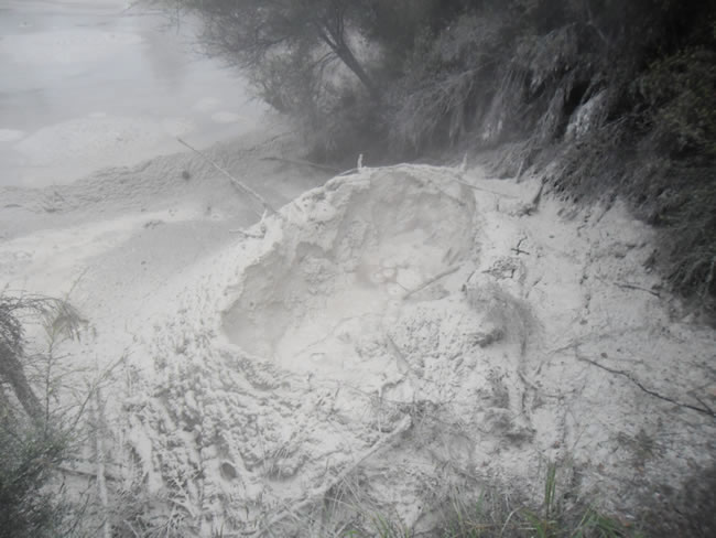 Rotorua to Auckland, New ZealandWe headed south down State Hwy 5 towards Wai-O-Tapu and took the loop around the thermal region. We spotted a sign to the Mud Pool so stopped to do the short walk around the area. This was impressive. There was steam rising all around us and sounds of erupting mud AND no entry charges. It was once the site of a large mud volcano, around 1920, which was destroyed by erosion. Select the photo below to see more bubbling mud pools. Previous | Album | Next |