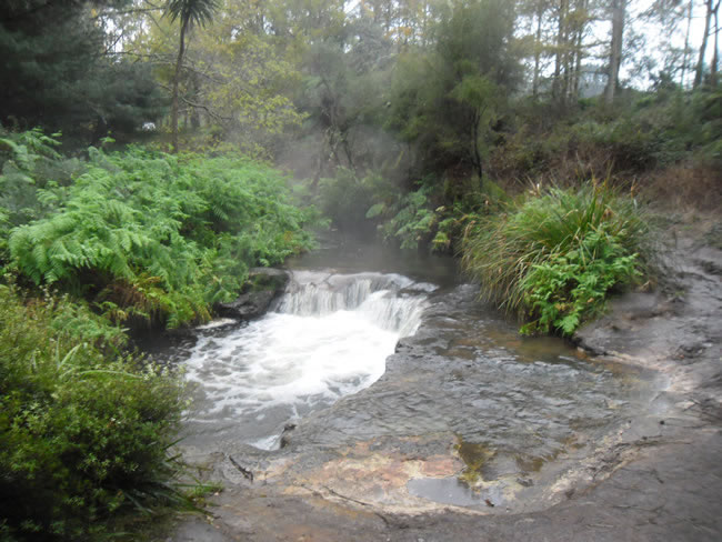 Rotorua to Auckland, New ZealandWe turned off the main highway to the right and found Kerosene Creek not far down a forestry road. The hot spring is a small stream that flows downhill through natural bush. Beautiful! Another well kept secret. Select the photo below to see more Previous | Album | Next |